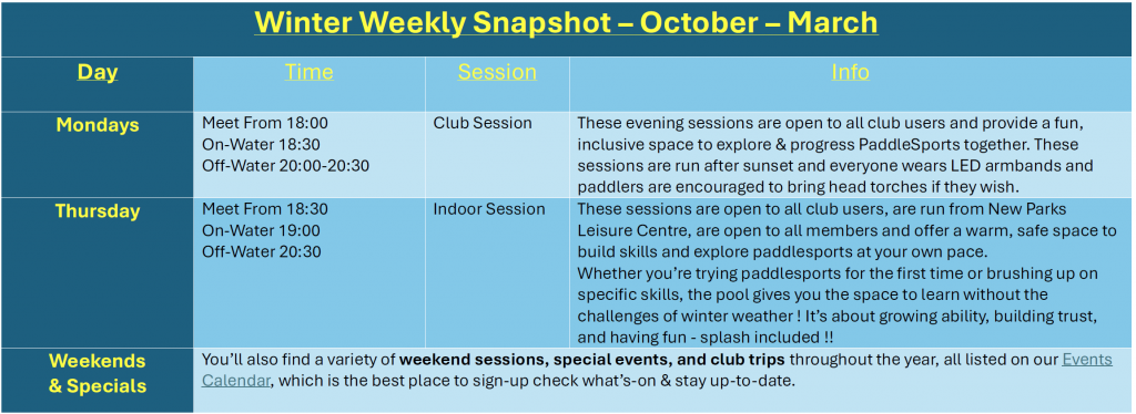 Although in the “Winter Season” (October – March) we do not run week night sessions from our Club Base, we do continue to run our weekend activities and trips as usual.